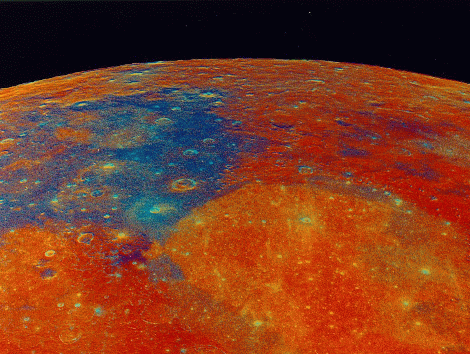 Immagine trattata matematicamente per mettere in risalto la maggiore (blu) o minore (arancio-rosso) presenza di titanio. Rappresenta i mari della Tranquillità e della Serenità, il primo in alto a sinistra, colorato in blu; il secondo a destra verso il basso, di colore arancio. La maggior parte dei continenti appare qui di colore rosso, indice di basso contenuto di titanio e di ferro.