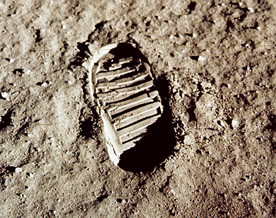 L'impronta della scarpa di Buzz Aldrin impressa sul suolo lunare.