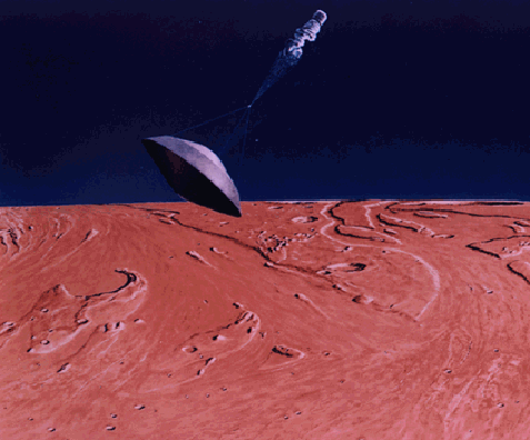Apertura del paracadute del modulo del Viking. (Disegno).