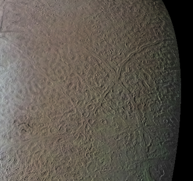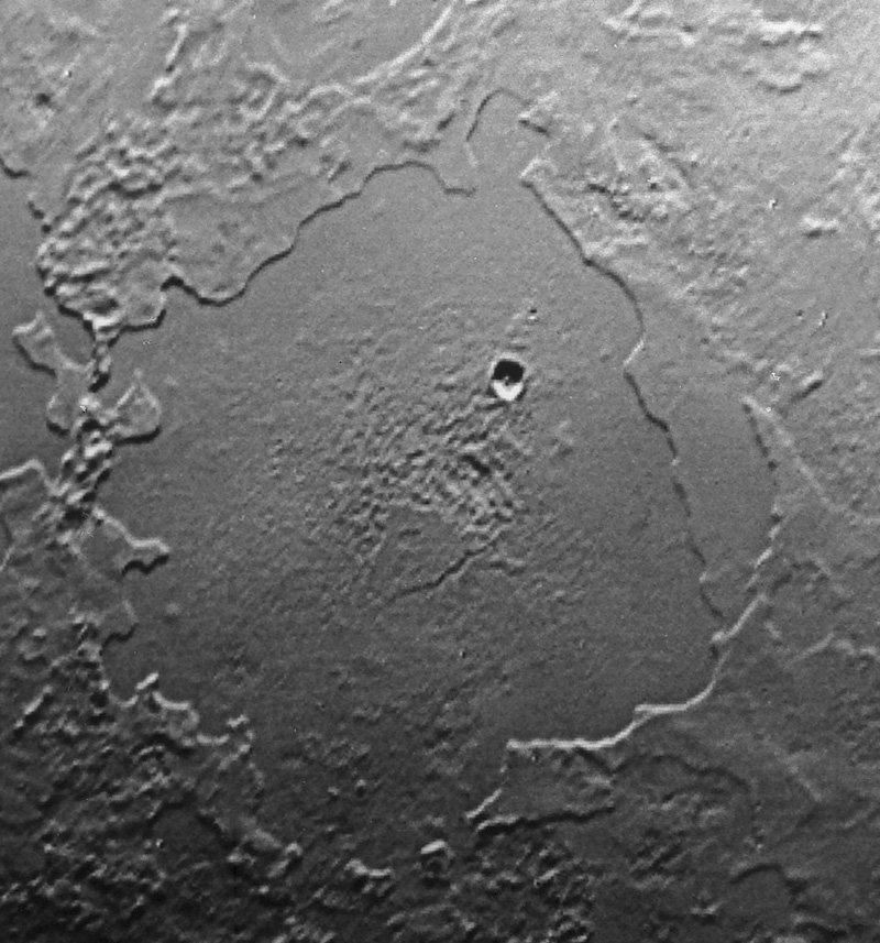 Si osserva inoltre una pianura di forma quasi circolare di 200 km di diametro con un bordo di colline alte circa 200 metri che somiglia quasi ad un lago ghiacciato. All'interno si nota un cratere da impatto con un diametro di 13 km ed un dislivello tra il punto più alto e quello più basso di 1 km.