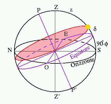 Quando il Sole si trova a sud (passa in meridiano) la sua distanza dalla verticale dell'osservatore (zenit), misurata lungo il meridiana, viena detta distanza zenitale. La distanza zenitale z dipende dalla latitudine del luogo e dalla declinazione del Sole ed è data da: