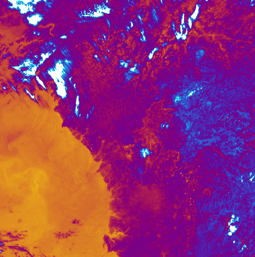 Sulla scala di colori dell'immagine, le aree più fredde (nubi) sono blu, mentre dal viola al giallo sono rappresentate temperature crescenti. L'Oceano Atlantico appare arancione e la terra, più fredda, rossa. Gli incendi si vedono come punti di colore giallo brillante, soprattutto a destra in basso (in Sierra Leone). La temperatura di questi punti è circa 300° K (circa 27° C) e si avvicina alla massima temperatura misurabile con lo strumento a bordo del satellite (300° K). Questo valore non rappresenta evidentemente la temperatura del fuoco perchè non tutta l'area coperta da un singolo pixel (1 km 2) sta bruciando. Immagine a 3.7 micron, del 26 gennaio 1992. Sono coperti (512x512) km2. Università di Leicester (UK) --- http://atsrw3.ag.rl.ac.uk/atsr1/images/ |