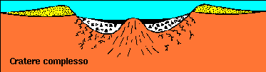 I crateri complessi sono crateri più larghi nei quali l'impatto ha fuso completamente il terreno formando strutture centrali tipo picchi o anelli, con una sezione a forma di "goccia di latte". Il rapporto tra profondità e diametro è in questo caso di 1:10 - 1:20 |