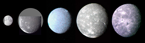 Mosaico dei satelliti maggiori di Urano. Da sinistra verso