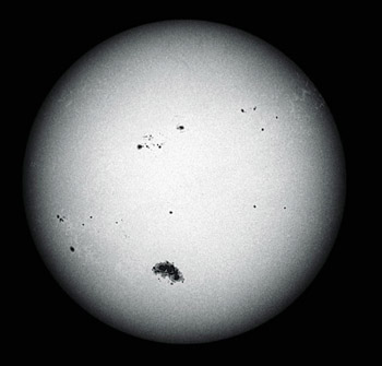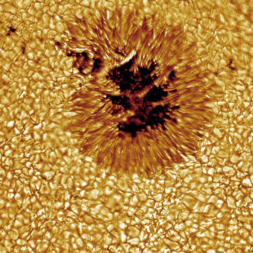 nel 1610. Le macchie solari rappresentano dettagli ben identificabili sulla fotosfera, seguendo i quali nel tempo si ha l'evidenza della rotazione del Sole intorno ad un asse polare. Il sole non ruota come un corpo solido, ma il periodo di rotazione aumenta andando verso i poli (rotazione differenziale). Esso è di circa 32 giorni in vicinanza dei poli e di circa 27 giorni in vicinanza dell'equatore solare. Nei gruppi di macchie si distinguono una macchia di testa e una macchia di coda, nel senso della rotazione solare. Una tipica macchia solare è costituita da un'area grossolanamente circolare oscura, detta ombra, circondata da una zona grigiastra, detta penombra, con una caratteristica struttura radiale. Le macchie più grandi possono avere un diametro di alcune decine di migliaia di chilometri. Una grande macchia solare può quindi contenere comodamente al suo interno la Terra. Le osservazioni consentono di affermare che le macchie sono sedi di vere e proprie aree cicloniche, simili (ma su scala infinitamente più grande) a trombe d'aria, che succhiano il materiale dagli strati immediatamente inferiori della fotosfera e lo proiettano in alto con moto vorticoso, raffreddandolo. Un dato importante che riguarda le macchie è quello del forte campo magnetico associato ad esse, fino a qualche migliaio di gauss. I campi magnetici delle macchie di testa e delle macchie di coda hanno sempre polarità magnetica opposta. |