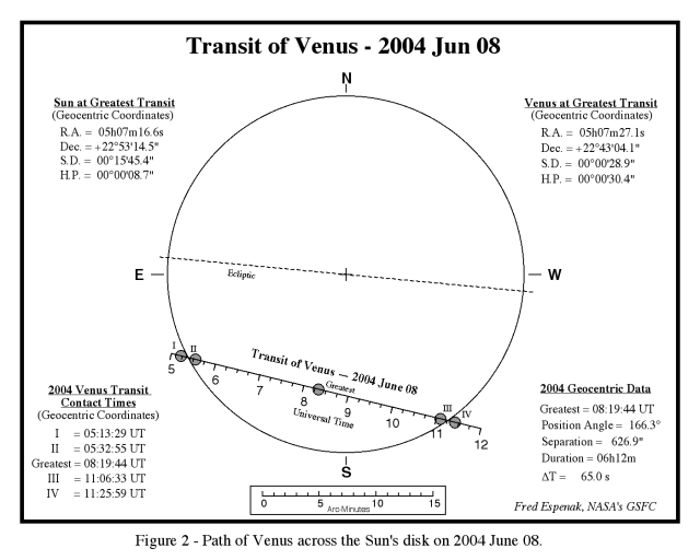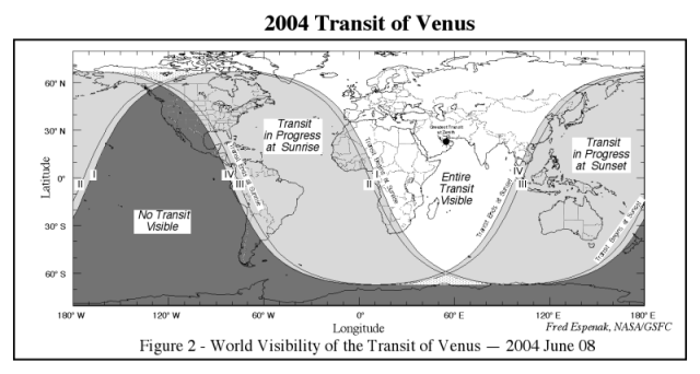 Il prossimo passaggio di Venere sul disco solare dell’8 giugno 2004 sarà interamente visibile in Europa, Medio Oriente, buona parte dell’Africa (ad esclusione della parte più occidentale) e dell’Asia (eccetto le zone più orientali).