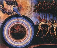 5. Giovanni di Paolo, La creazione del mondo e la cacciata di Adamo ed Eva dal Paradiso, 1445. In questo dipinto l’universo è immaginato come un’insieme di corone circolari, la terra è situata al centro dell’universo e Dio è situato in altoi nell’atteggiamento di chi governa ogni cosa