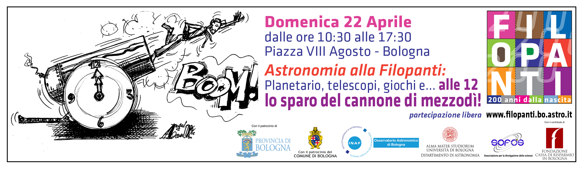 22 aprile. Parco della Montagnola e Piazza VIII Agosto, Bologna, ore 10:30. "Lezione popolare alla Filopanti" e sparo del cannone a mezzodì!