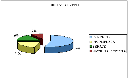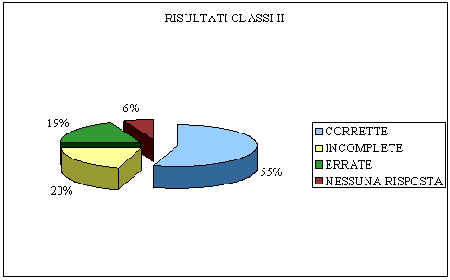 Tutte le classi hanno mostrato più del 50% di risposte corrette, che, se sommate a quelle incomplete o parzialmente corrette raggiungono oltre il 75% di risposte valide. Questo è da considerarsi un ottimo risultato, se si tiene presente l'ambiente e la nuova modalità di lavoro e di studio in cui sono stati coinvolti i ragazzi.