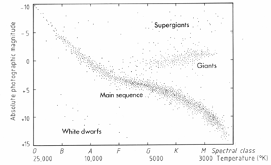 Un analogo diagramma, noto col nome di diagramma di Hertzsprung-Russell, rappresenta la relazione tra temperatura e luminosità (Fig.3). Analogamente a quanto accade a massa e luminosità, il diagramma di H-R mostra una stretta dipendenza tra temperatura e luminosità (e, di conseguenza, tra massa e temperatura).