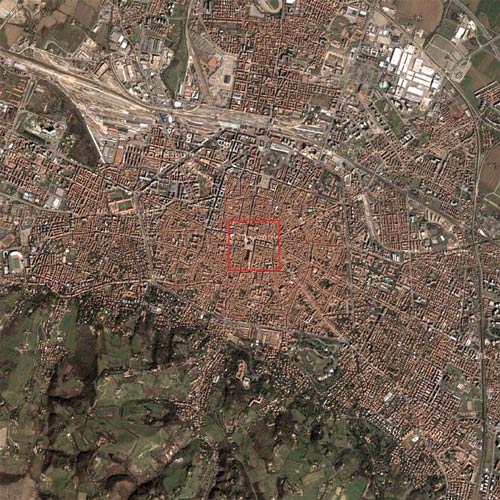 10.000 metri.Visto da questa distanza il centro di Bologna appare con la sua forma inconfondibile disegnata dalla terza cinta muraria e sottolineata dai viali che circoscrivono il centro storico.