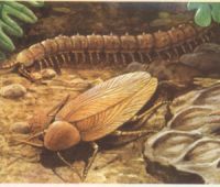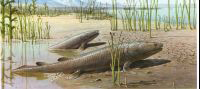 Periodo Devoniano. Continua la diversificazione dei pesci e fanno la loro comparsa i primi pesci dotati di bocca mobile. Da alcuni di questi in grado di integrare la respirazione acquatica con la respirazione aerea si differenziano i primi anfibi. Alcuni gruppi di artropodi, millepiedi, scorpioni e insetti, conquistano l'ambiente terrestre. Il periodo si chiude con l'estinzione di circa l'82 per cento delle specie esistenti.