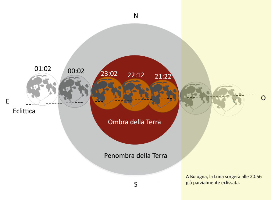 Parco di Villa Smeraldi, San Marino di Bentivoglio - Bologna, 15 giugno. Gli oltre 500 partecipanti hanno assistito all'eclisse totale di Luna e al fenomeno così detto della "Luna rossa" guidati dagli astronomi dell'Osservatorio Astronomico di Bologna. La Luna si è levata già parzialmente immersa nell'ombra della Terra, per assumere il tipico colore rosso scuro al culmine del fenomeno celeste, dalle 21:22 alle 23:02. Le osservazioni, svolte direttamente con l'occhio ai numerosi telescopi allestiti per l'occasione nel parco della Villa, sono state accompagnate dalla proiezione su maxi-schermo di spettacolari immagini della Luna catturate in tempo reale durante l'eclisse. Inoltre, un potente raggio laser ha guidato il pubblico in un affascinante viaggio tra i diversi oggetti celesti. Lo schema del fenomeno