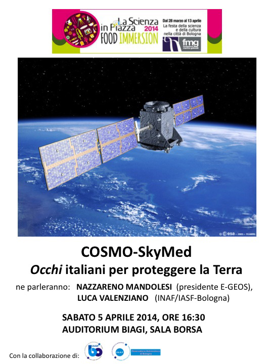 Sabato 5 Aprile 2014Occhi italiani per proteggere la Terra Alle ore 16.30 Auditorium Biagi, Sala Borsa Ne parleranno Nazzareno Mandolesi (presidente E-GEOS), Luca Valenziano (INAF/IASF-Bologna)
